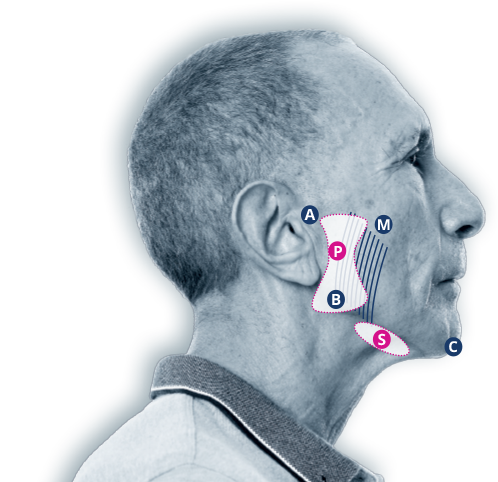 XEOMIN® is injected into the parotid and submandibular glands on both sides (i.e., 4 injection sites per treatment session). The injection site should be close to the centre of the gland.